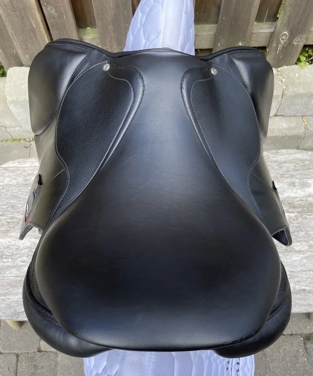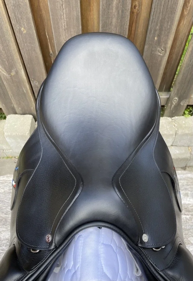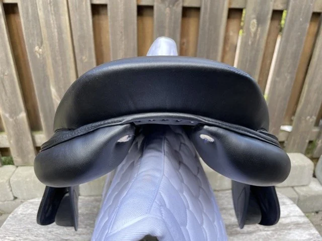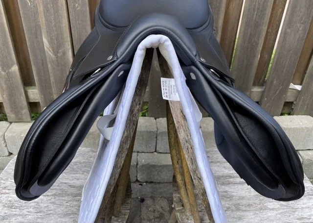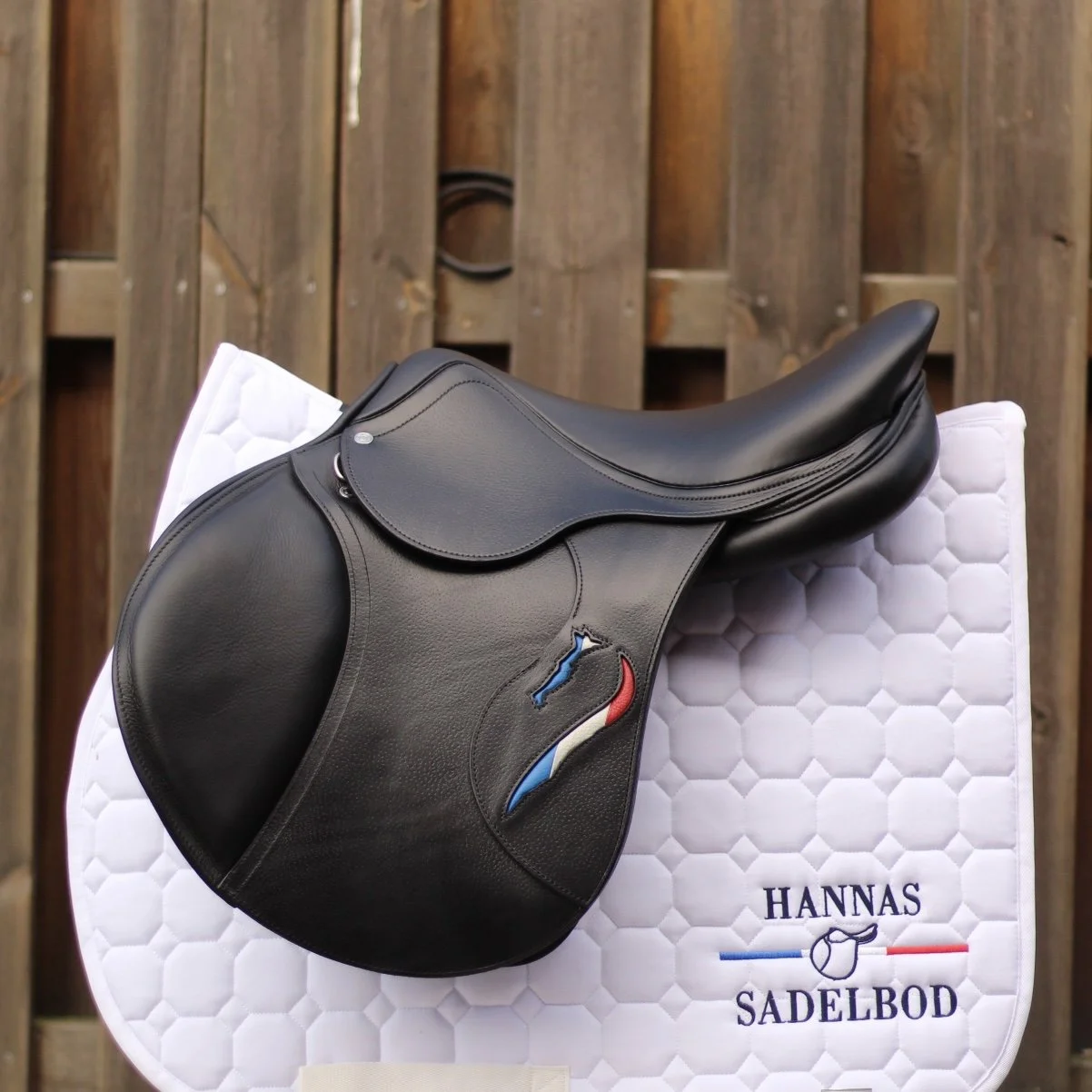 Svart 16,5 tum hoppsadel med halvdjupt säte och kåpstorlek 1A som passar ryttare runt 160 cm. Bomvidden är normal mot vid.