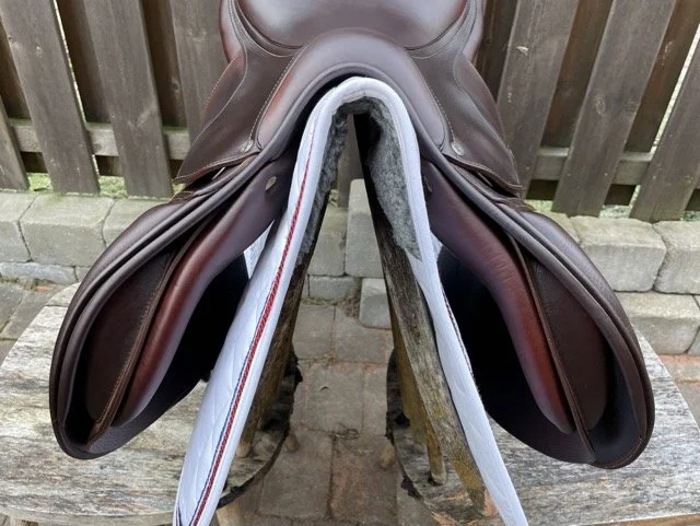 Brun 17 tum hoppsadel i dubbelsytt kalvskinn med säte åt det djupare hållet och kåpstorlek 2AB som passar ryttare runt 170 cm. Bomvidden är vid