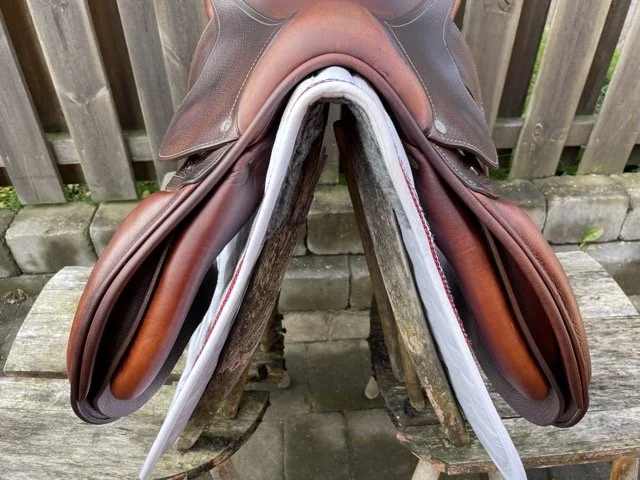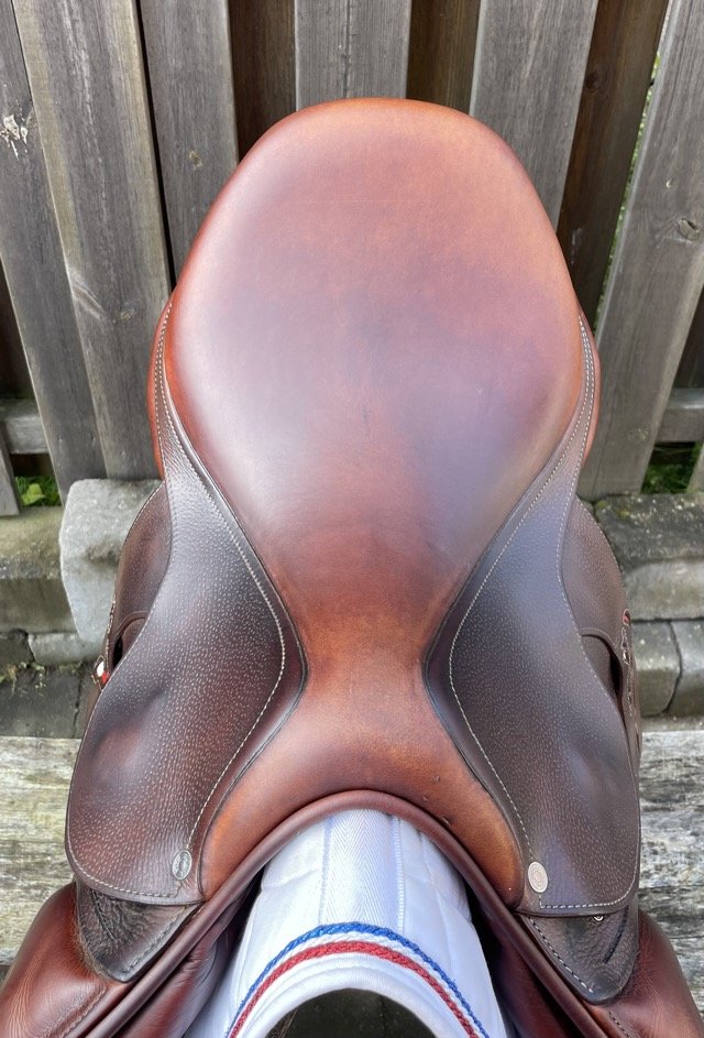 Brun 17,5 tum hoppsadel med halvdjupt säte och kåpstorlek 3AAB som passar ryttare runt 180-190 cm långa. Bomvidden är normal.