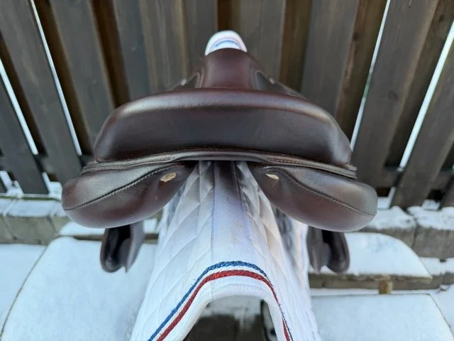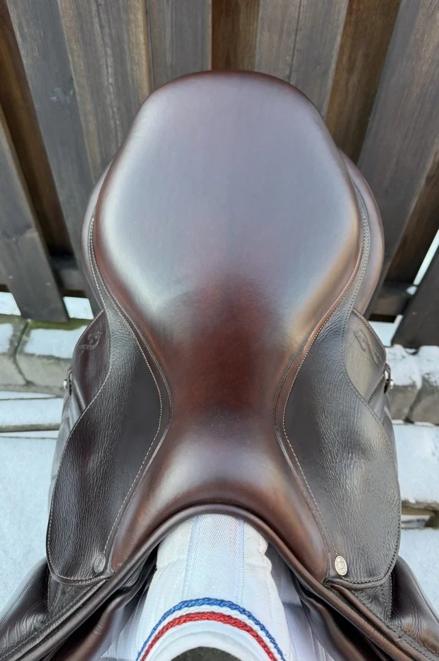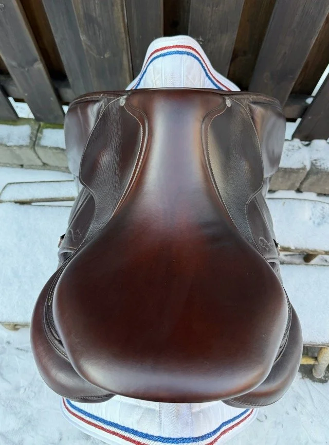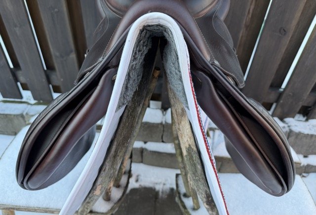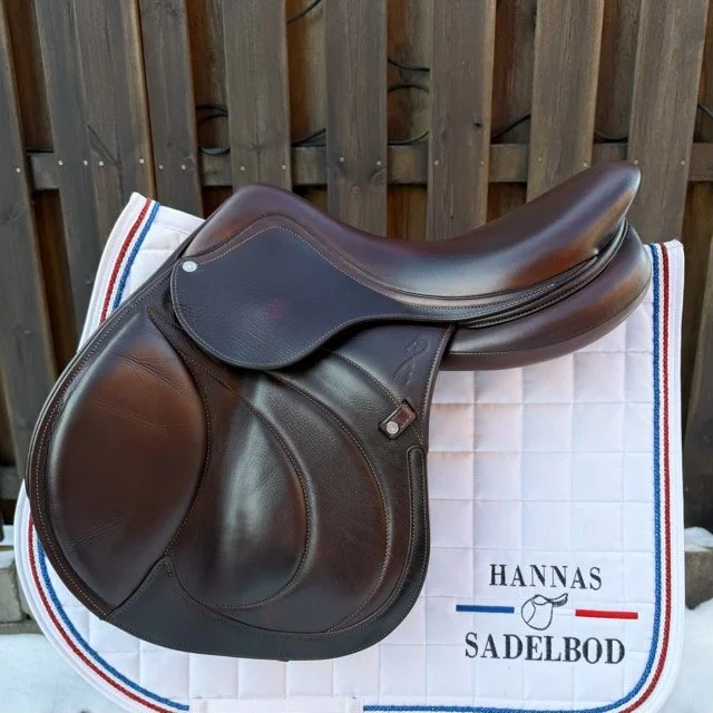 Brun 17 tum hoppsadel med säte åt det plattare hållet och kåpstorlek 2A som passar ryttare runt 165-170 cm långa. Bomvidden är normal mot smal.