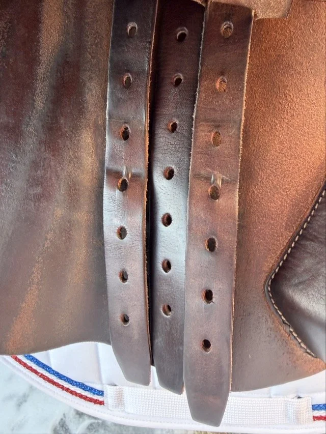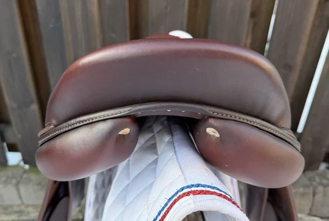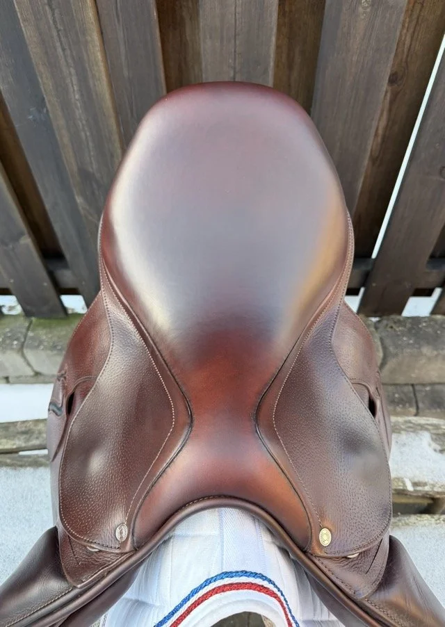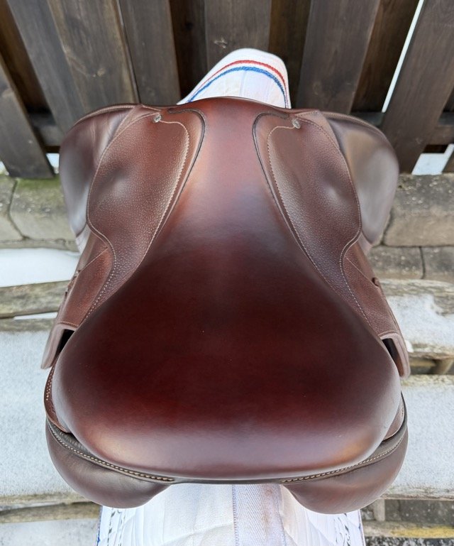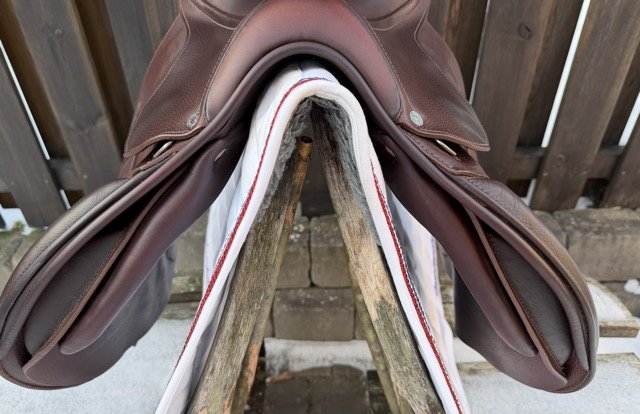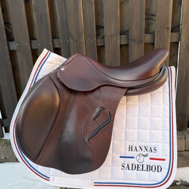 Brun 17 tum hoppsadel med halvdjupt säte och kåpstorlek 2NB som passar ryttare runt 160-165 cm långa. Bomvidden är normal mot vid.