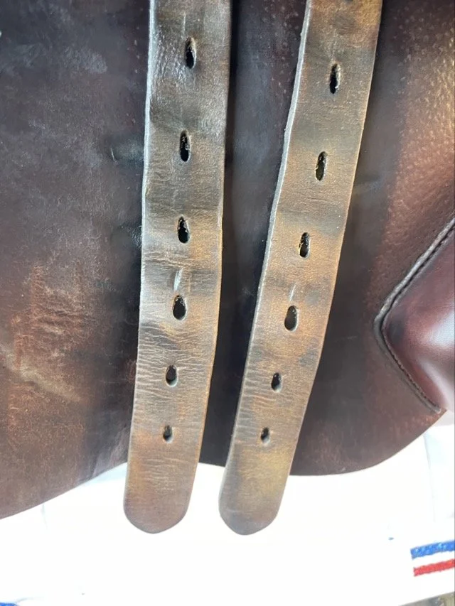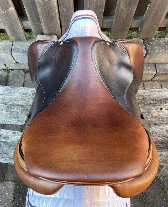 Brun 17 tum hoppsadel med halvdjupt säte och kåpstorlek 4A som passar ryttare runt 165-170 cm. Bomvidden är generös normal.
