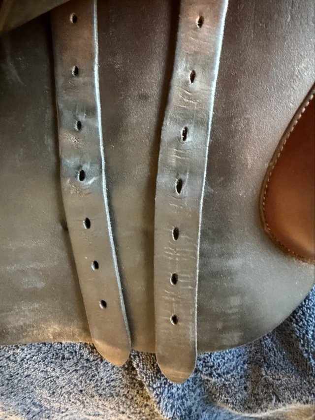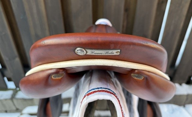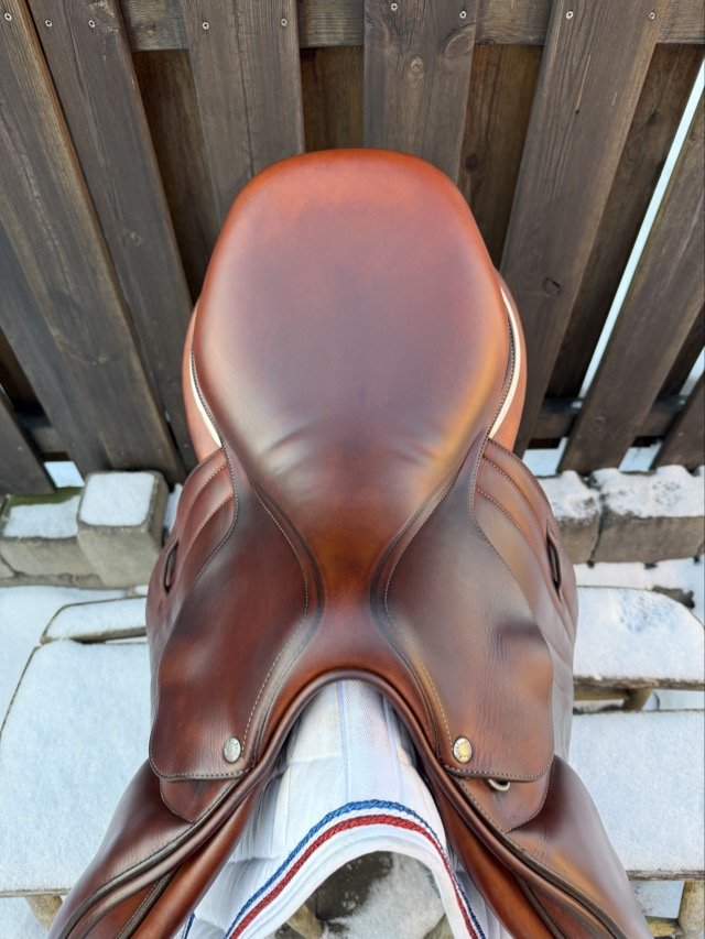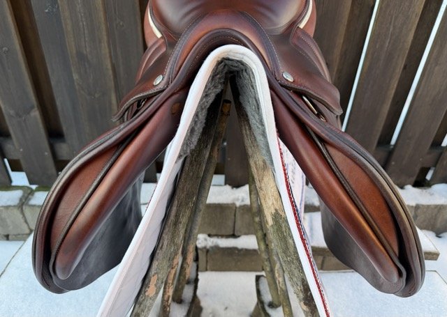 Goldenfärgad 17,5 tum hoppsadel helt i dubbelsytt kalvskinn med plattare säte och normal sitsbredd. Bomvidden upplevs som normal och kåpstorleken är 2,5 för ryttare ca 170-180 cm långa.