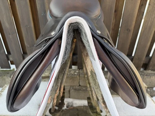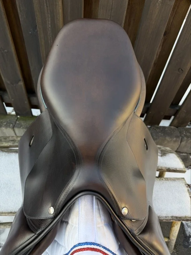 Cajou-färgad 17 tum hoppsadel med platt säte och normal sitsbredd. Bomvidden är normal och kåpstorleken 2,5 dvs större och mer framskuren för ryttare runt ca 170-175 cm.