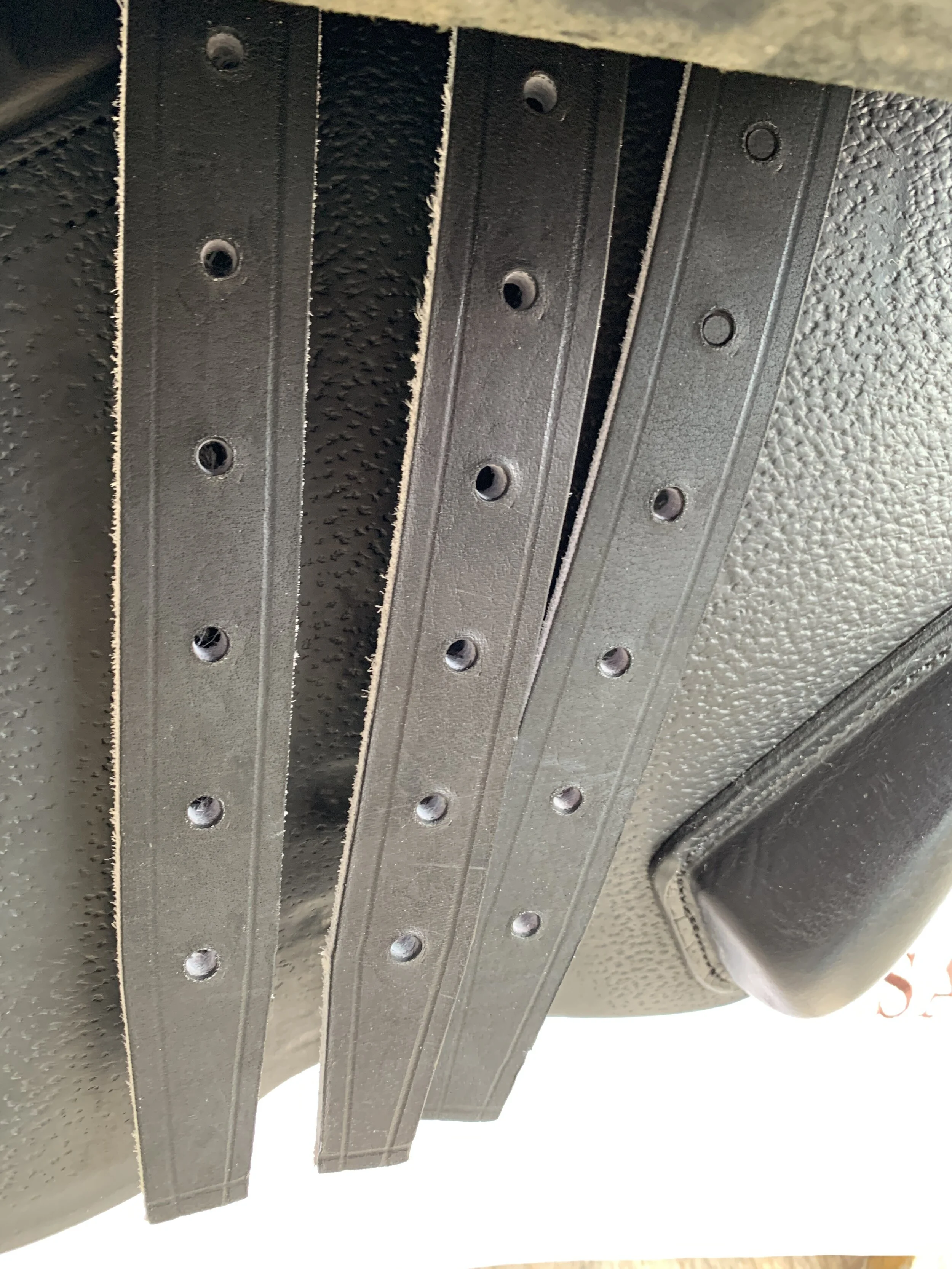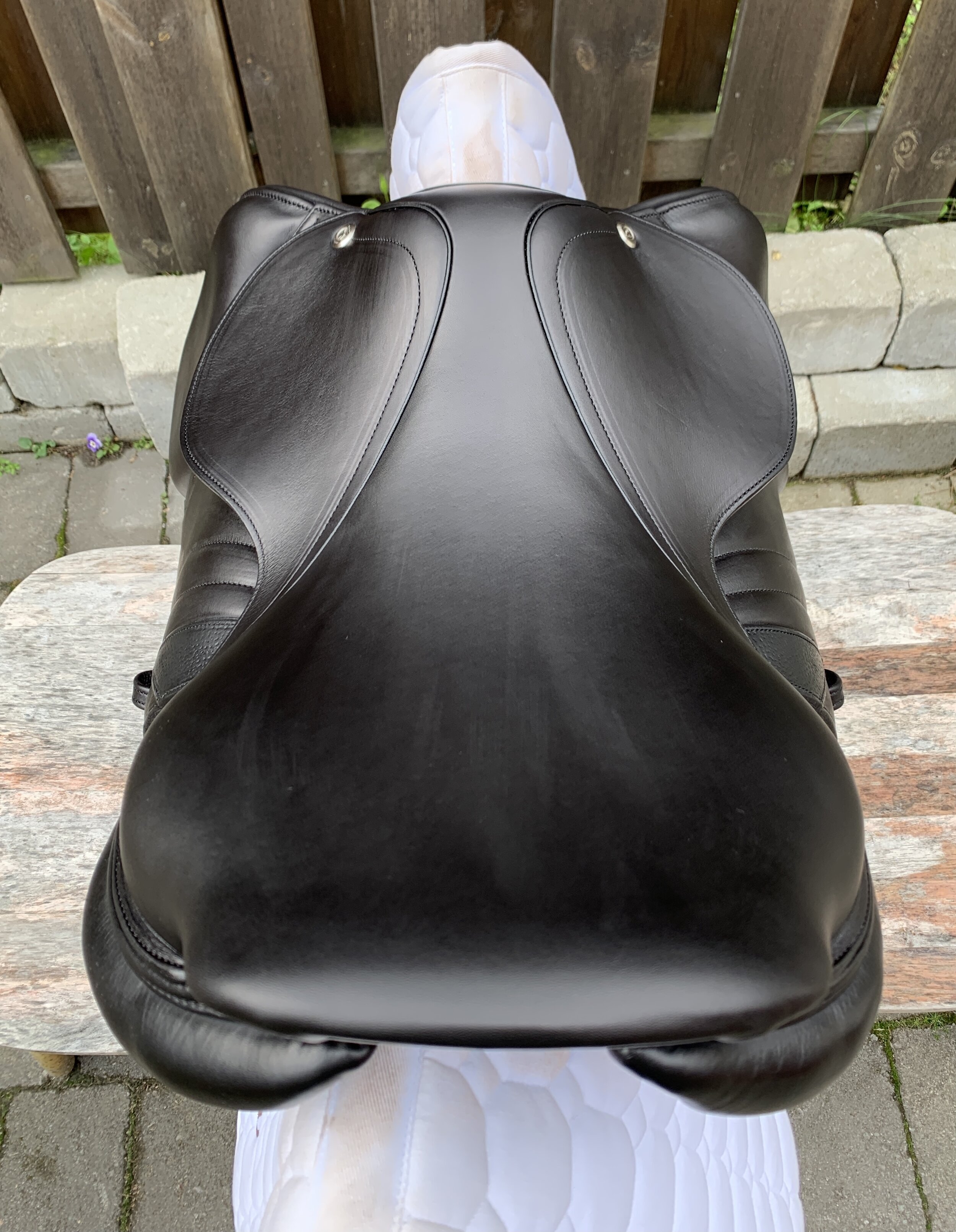 Svart 17,5 tum hoppsadel helt i dubbelsytt kalvskinn med halvdjupt säte och kåpa 3C, vilket passar ryttare runt 170-180 cm. Bomvidden uppfattas som normal mot vid.