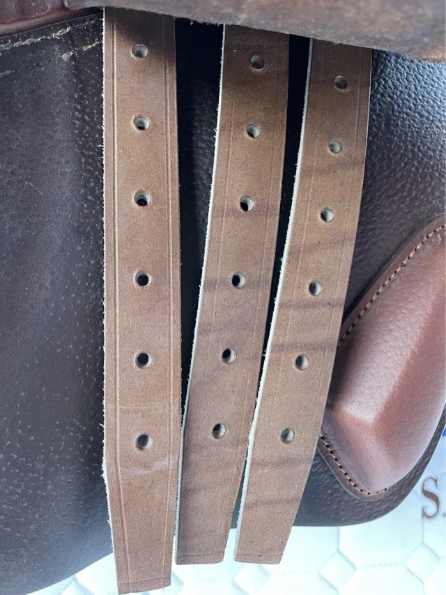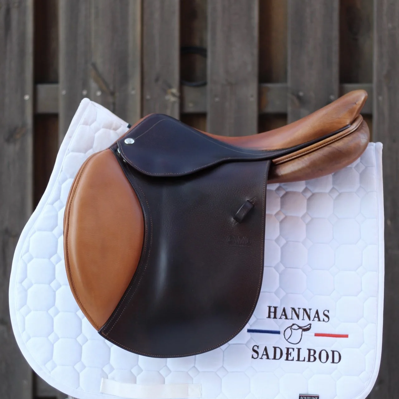 Kastanjefärgad 17,5 tum close contact hoppsadel med säte åt det plattare hållet och kåpa 3L, vilket passar ryttare runt 170-175 cm. Bomvidden uppfattas som normal mot vid.