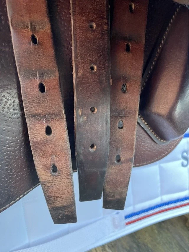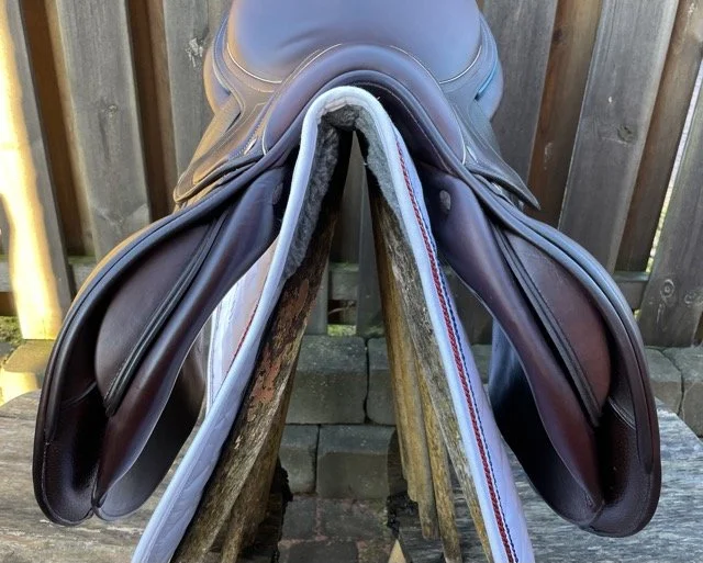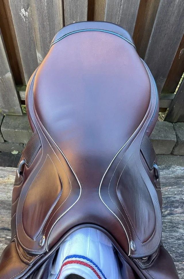 Kastanjefärgad 17,5 tum hoppsadel med plattare säte och kåpa 3C vilket passar ryttare runt 170-180 cm. Bomvidden uppfattas som normal mot vid.