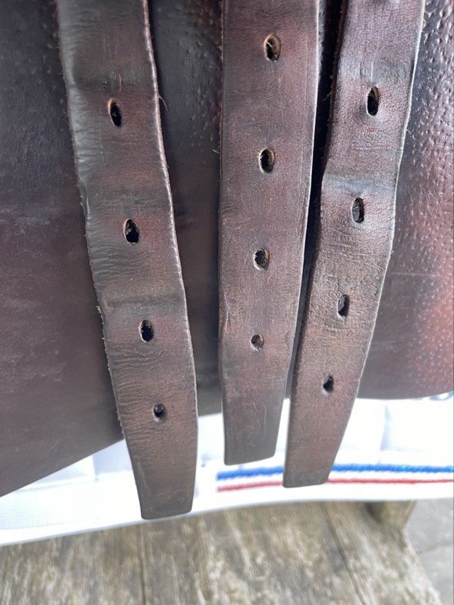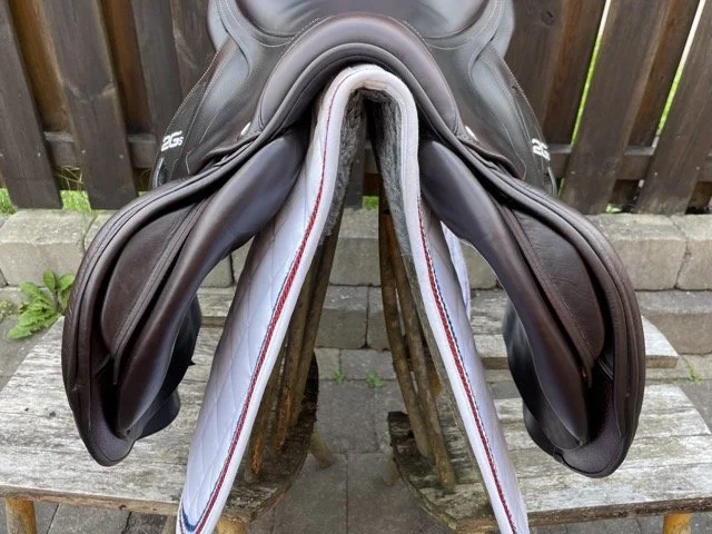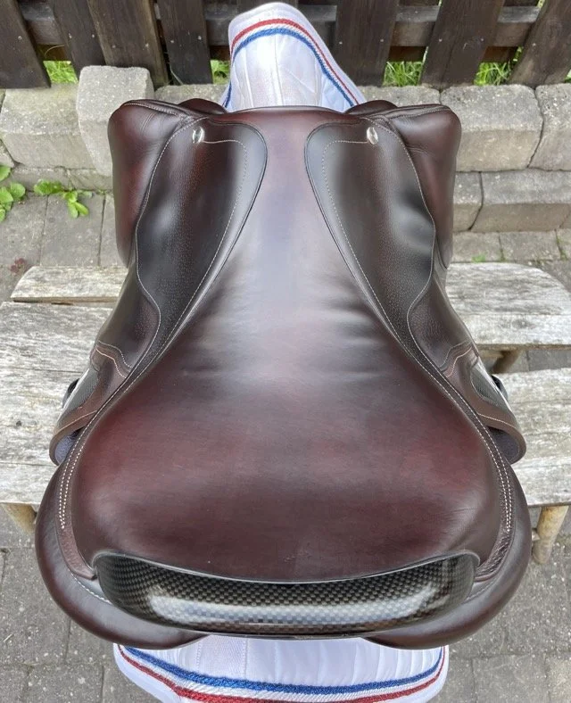Kastanjefärgad 17,5 tum hoppsadel med halvdjupt säte och kåpa 3C vilket passar ryttare ca 170-180 cm. Bomvidden uppfattas som normal.