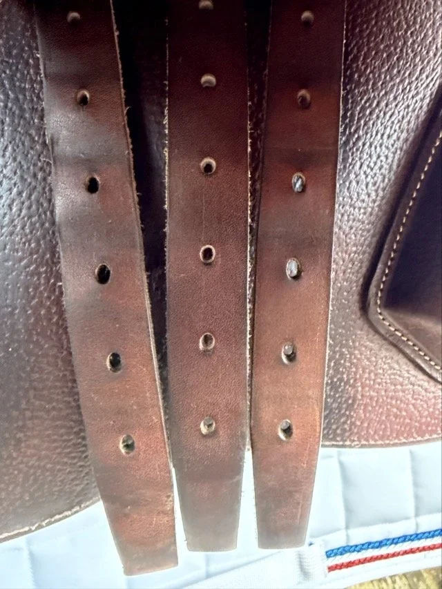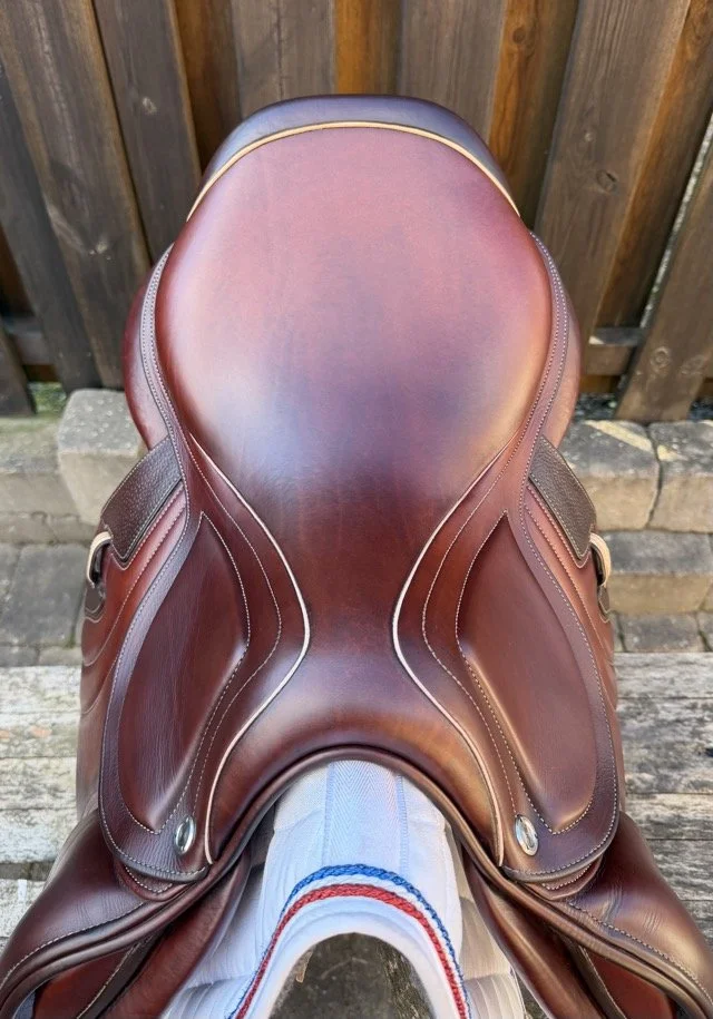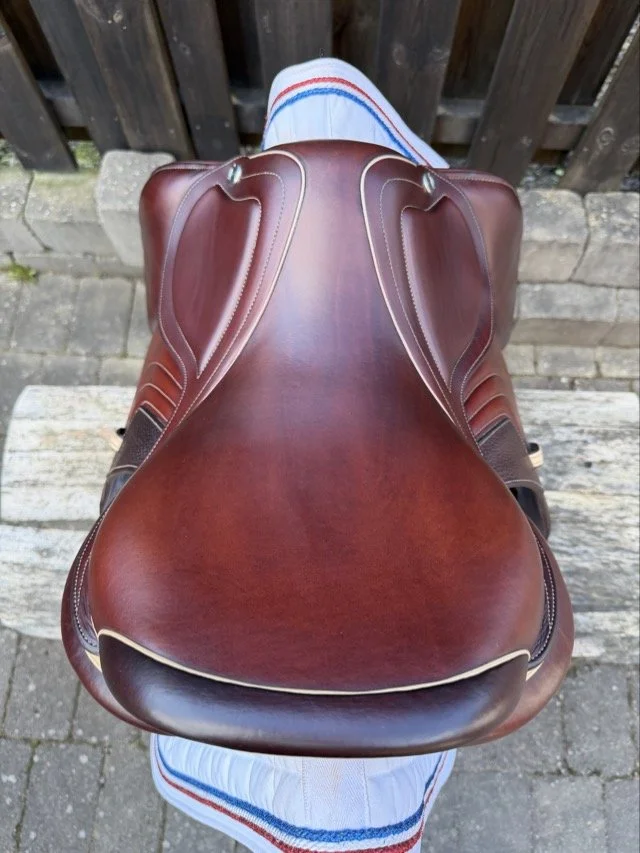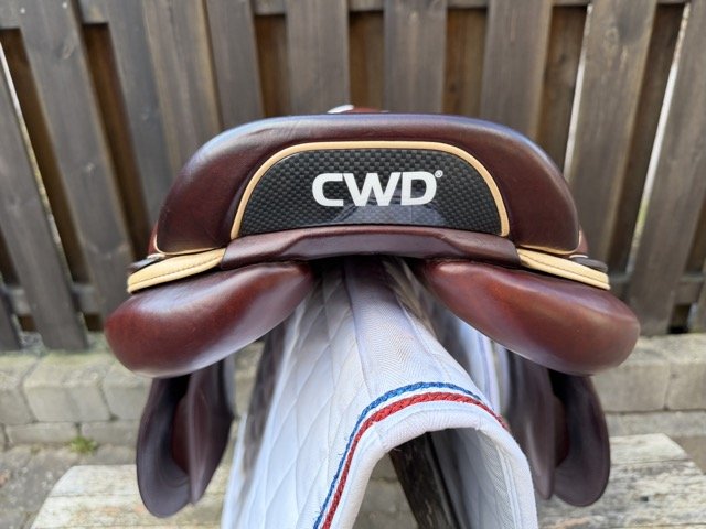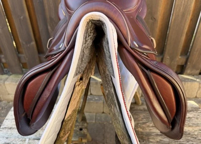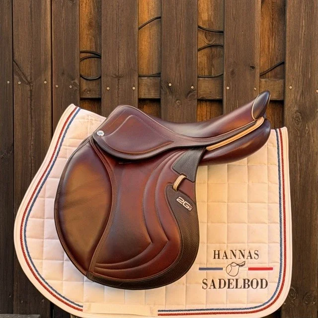 Kastanjebrun 17 tum hoppsadel med säte åt det plattare hållet och kåpa 2L som passar ryttare ca 160-165 cm. Bomvidden uppfattas som normal.