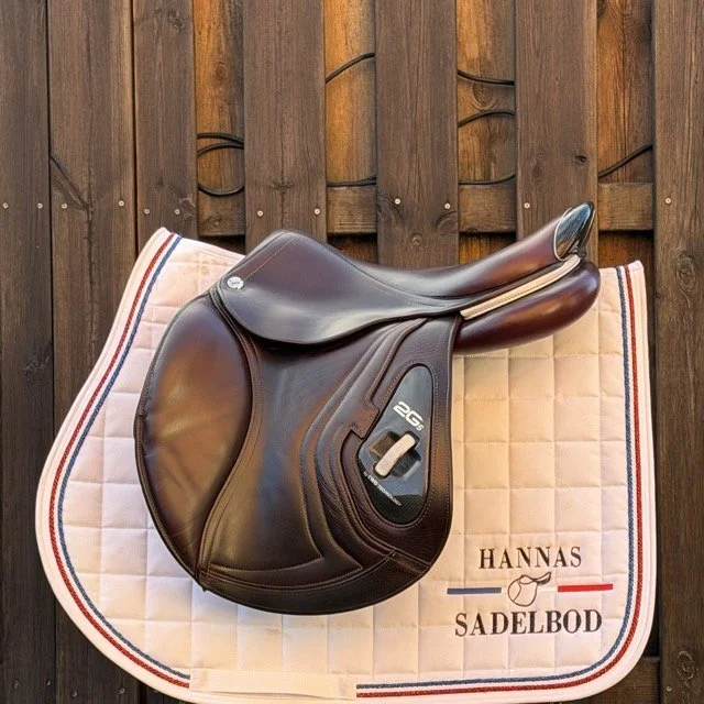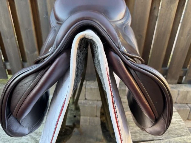 Kastanjefärgad 16,5 tum lyxig hoppsadel i dubbelsytt kalvskinn med halvdjupt säte och kåpa 2C som passar ryttare ca 160-165 cm. Bomvidden upplevs som normal mot vid.