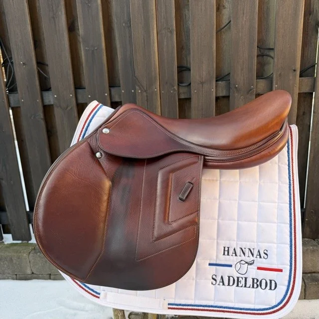 Kastanjefärgad 16,5 tum lyxig hoppsadel i dubbelsytt kalvskinn med halvdjupt säte och kåpa 2C som passar ryttare ca 160-165 cm. Bomvidden upplevs som normal mot vid.