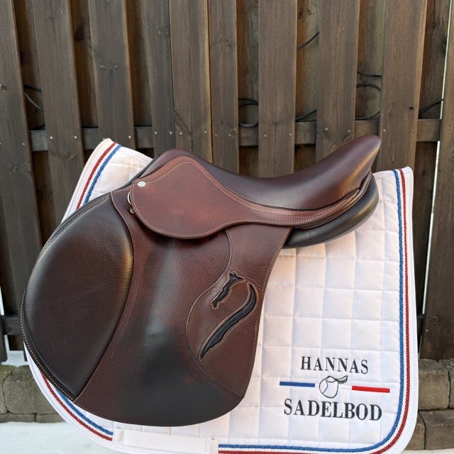 Kastanjefärgad 17 tum hoppsadel med halvdjupt säte och kåpa 3C, vilket passar ryttare runt 170-175 cm. Bomvidden uppfattas som normal.