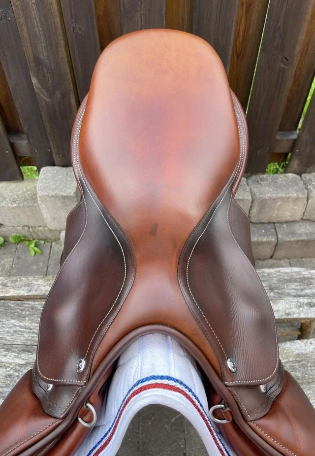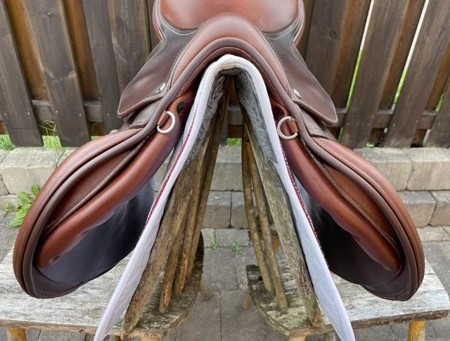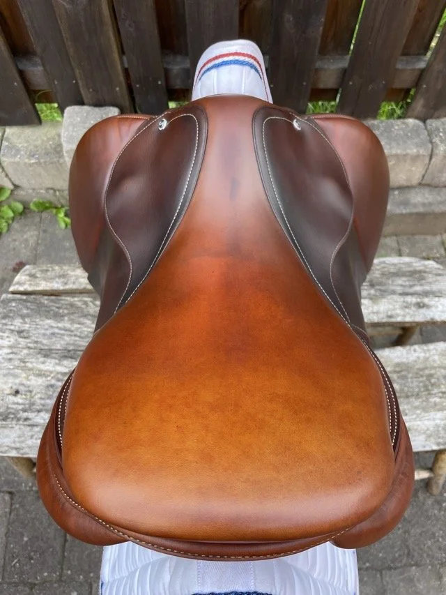 Goldenfärgad 18” hoppsadel med plattare säte och kåpstorlek L vilket passar ryttare ca 170-180 cm. Bomvidden är 34 och omvärmningsbar mellan 29-37.