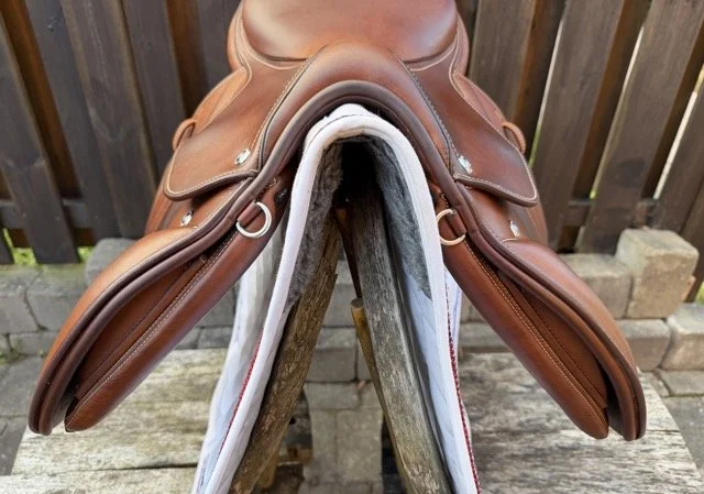 Goldenfärgad 16” hoppsadel med plattare säte och kåpstorlek MC vilket passar ryttare 155-160 cm. Bomvidden är 34 och omvärmningsbar mellan 29-37.