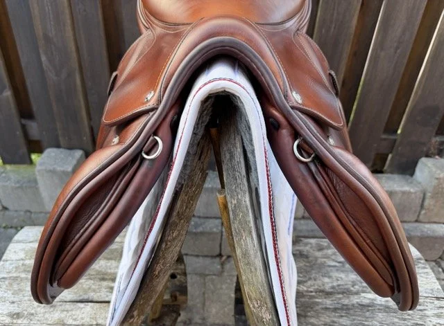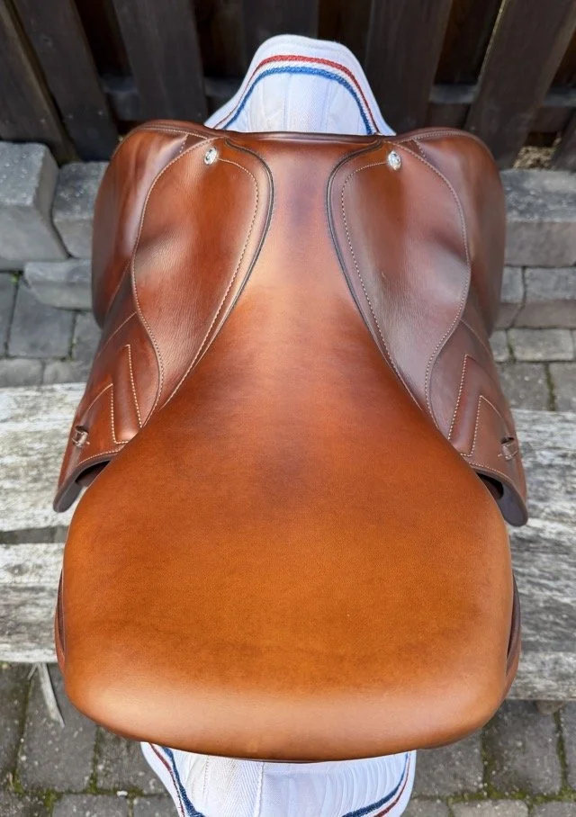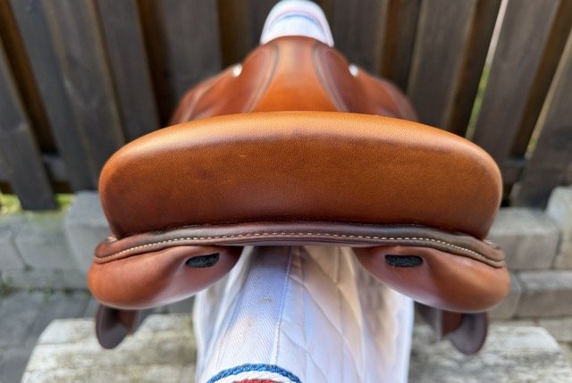 Goldenfärgad 17” hoppsadel med säte åt det plattare hållet och kåpstorlek LC vilket passar ryttare ca 170-175 cm. Bomvidden är 34 och omvärmningsbar mellan 29-37.