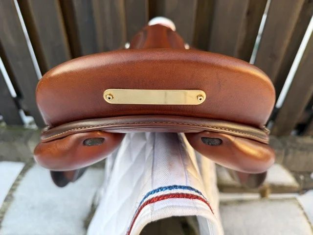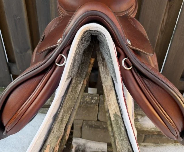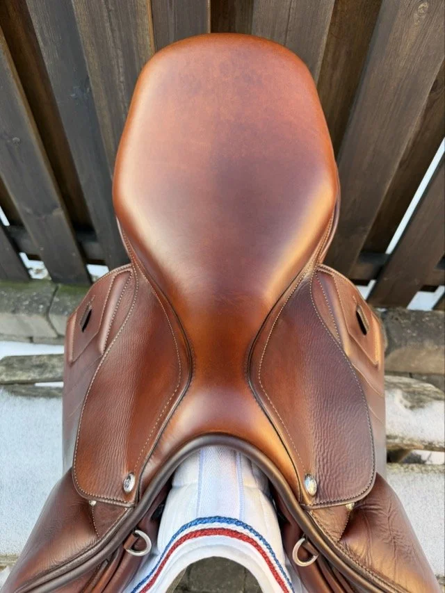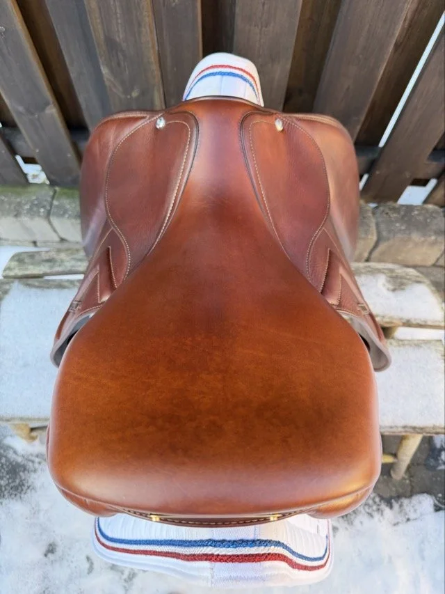 Goldenfärgad 18” hoppsadel med säte åt det djupare hållet och kåpstorlek LC vilket passar ryttare ca 175-185 cm. Bomvidden är 33 och omvärmningsbar mellan 29-37.