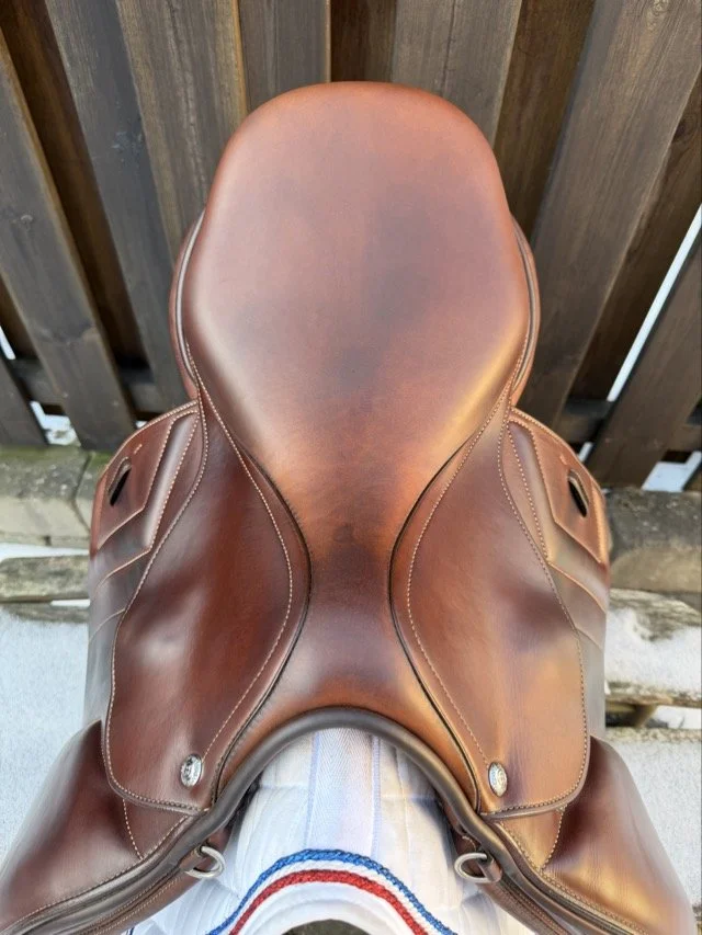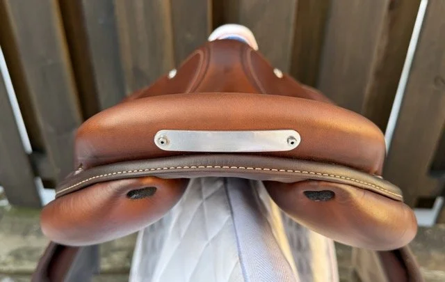 Goldenfärgad 16” hoppsadel med plattare säte och kåpstorlek MC vilket passar ryttare 155-160 cm. Bomvidden är 34 och omvärmningsbar mellan 29-37.